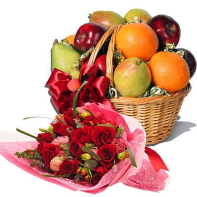 6 items Fresh Fruit Basket w/ 12 red rosessame like picN0TE: FRUITS ITEMS MAY VARY ..DEPEND ON TH AVAILABILITY |
