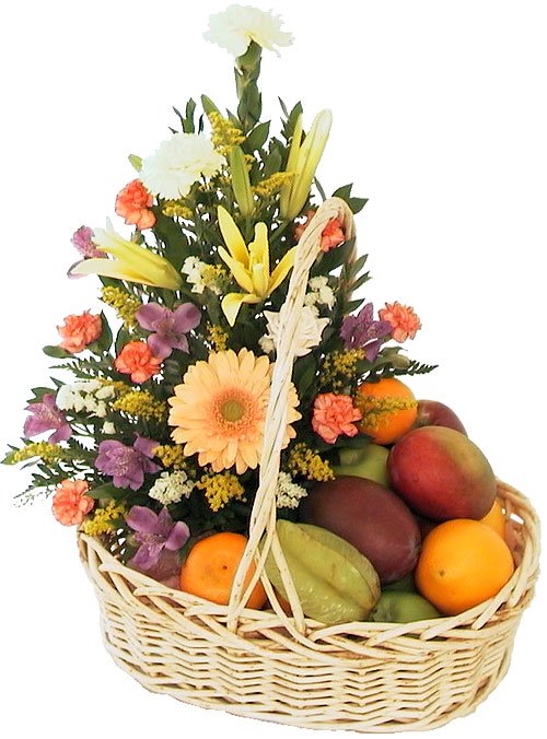 Especially For You...Description: pink snapdragons, yellow stargezer,oranges carnation .,with 6 item's fruits in a basket Your gift will come with a greeting card and your message . |