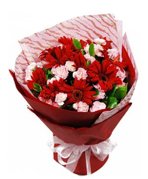 Good Wishes18 pink carnation + 10 red gerbera be packed in red crepe paper bouquet. |