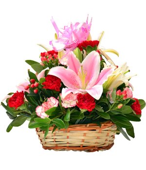 Happiness Harbor2 pink lilies, 2 white lilies, 10 red carnations, 12 pink carnations, green leaves and pink bowknot tied basket. Available for birthday, get well, festival and bestwishes. - Order 24 hours ahead. |