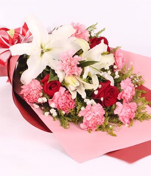 The Root & Green LeavesMixed hand bouquet includes 8 pink carnations, 2 stalks white perfume lilies and 3 stem red roses for express affection like the root and the green leaves. |