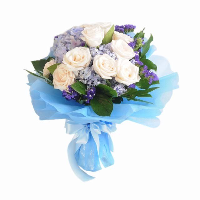 A bouquet of White Roses (12 stalks), Blue Hydrangea (3 stalks), Purple Eustomas & Ruscus
