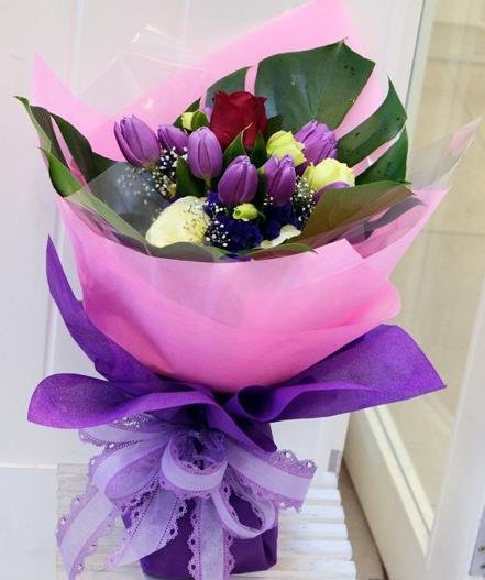 CONTE DE F��ESThis hand bouquet comes with 12 stalks of tulips and one roses in the middle. It is also mix with eustoma flowers and beautiful leaves. |